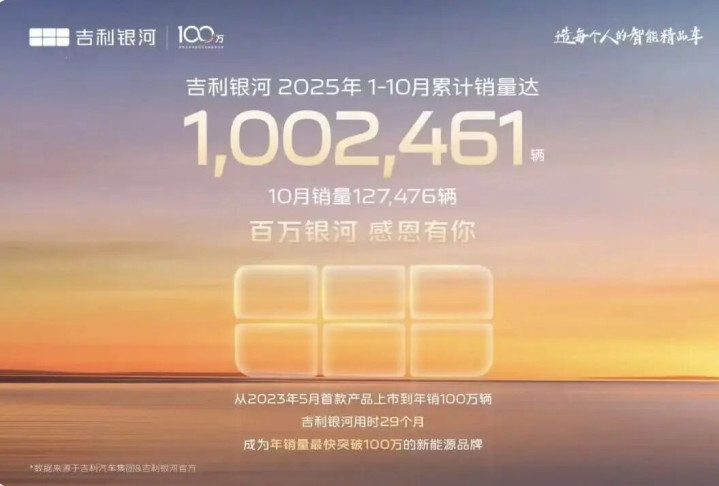 【导语:当不少品牌还在年度目标的赛道上奋力追赶时,吉利银河已全速冲线——凭借十月全系销量火爆突破127476辆的强劲势头,银河系列竟提前冲破年度百万销量大关。这不仅是吉利在新能源赛道上一场酣畅淋漓的领跑,更以“银河速度”改变市场竞争的格局;从上市之初便快速上量,到如今以颠覆性的产品力与创新生态持续破局,银河正成为吉利新能源矩阵中最耀眼的那颗星。】